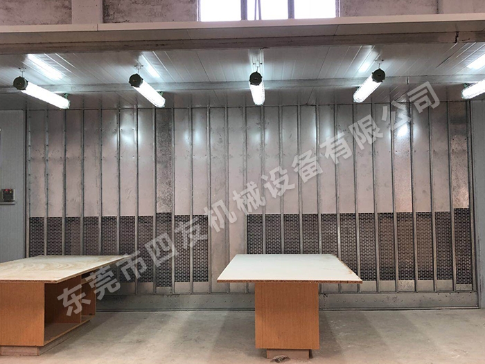 噴漆時(shí),外部空氣經(jīng)過(guò)初級(jí)過(guò)濾網(wǎng)過(guò)濾后由風(fēng)機(jī)送到房頂,再經(jīng)過(guò)頂部過(guò)濾網(wǎng)二次過(guò)濾凈化后進(jìn)入房?jī)?nèi)。房?jī)?nèi)空氣選用全降式,以0.2-0.3m/s的速度向下流動(dòng),使噴漆后的漆霧微粒不能在空氣中逗留,而直接經(jīng)過(guò)底部出風(fēng)口被排出房外。這樣不斷地循環(huán)轉(zhuǎn)換,使噴漆時(shí)房?jī)?nèi)空氣清潔度達(dá)98%以上,且送入的空氣具有一定的壓力,可在車的四周構(gòu)成一恒定的氣流以去除過(guò)量的油漆,從而zui大極限地確保噴漆的質(zhì)量。家具出產(chǎn)中廣泛選用噴涂工藝對(duì)家具進(jìn)行涂飾,選用噴涂工藝出產(chǎn)效率高,所構(gòu)成的漆膜均勻細(xì)膩、平坦光滑、附著力高。但在噴涂施工時(shí)被高壓空氣所霧化的涂料,構(gòu)成了大量的漆霧。漆霧是由涂料微粒和溶劑組成,漆霧比重很小,漂浮在空氣中。漆霧沉降在工件表面會(huì)影響工件的質(zhì)量,操作人員吸入漆霧也危害身體健康。